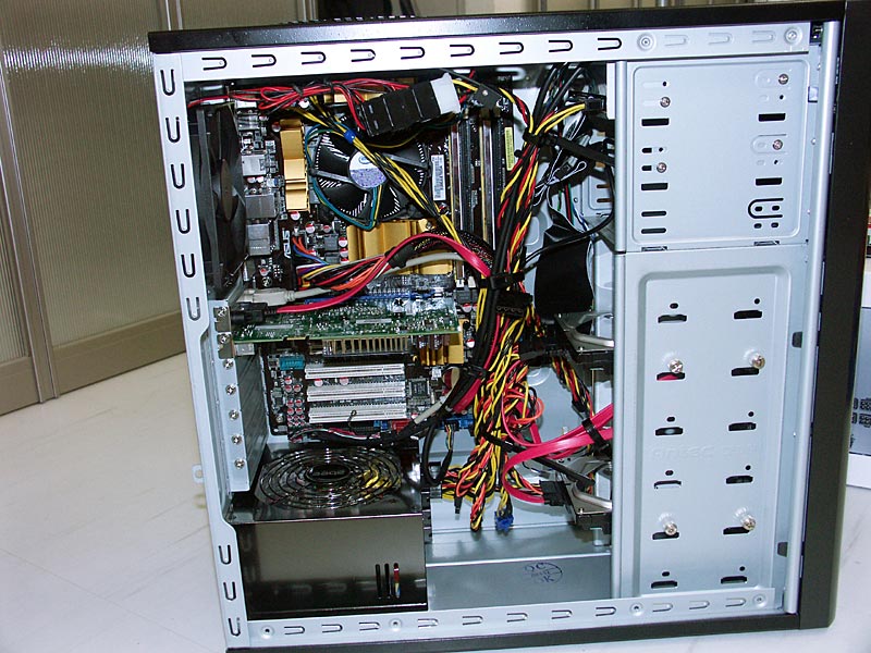 PCをサイドから。ケース上面には排気ファンがあるので電源が下部にある構成になっています。